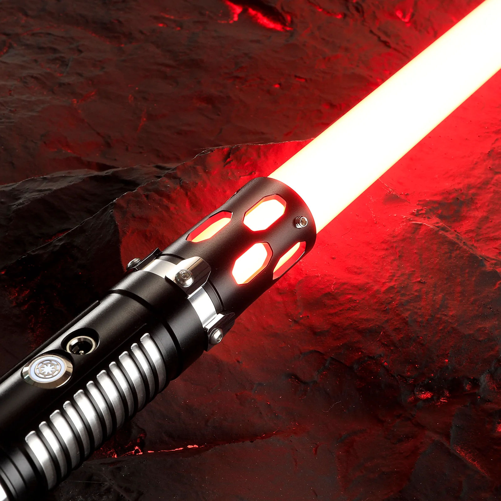Measuring in at 13.5 inches long, the Invictus gives enormous leverage for 2-handed saber users. The entire saber is adorned with grooves for grip, fins for proper heat dissipation, and a vented emitter that is both impressive in form as well as function.